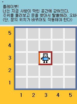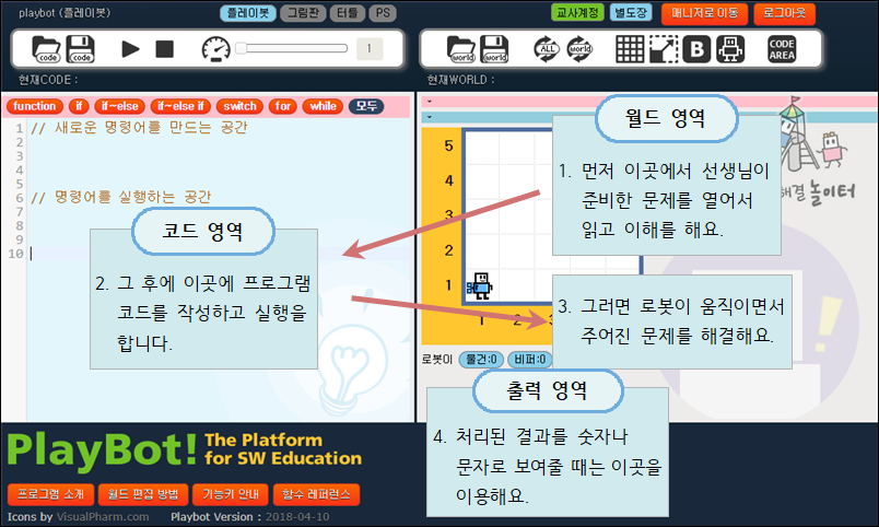 선생님의 문제를 확인하거나 로봇이 움직이면서 문제를 해결하는 부분을 "월드 영역"이라고 하고,