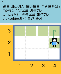 turn_right() 명령어는 없고 turn_left() 명령어만 있는 상태에서 오른쪽으로 바꾸려면 어떻게 해야 할까요? 잘 아는 학생 있으면 도와주세요!! 벌써 해결 방법을 찾았나요? 훌륭한 학생이군요. |