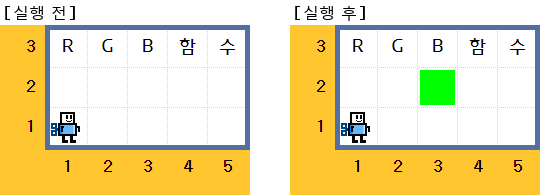 입력된 좌표(x,y) 칸의 RGB(Red,Green,Blue) 중에서 녹색 값을 설정한다.녹색 값은 0~255 사이의 숫자로 입력한다.